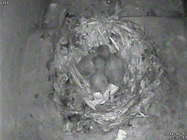 8am. A damp drizzly morning means no activity at the moment. No chicks went yesterday which surprised me as I thought the last one in NB4 south was ready to go. Also 2 adults I thought had gone have returned. One in NB2 north and the other in NB5 north. They must have decided it was better to spend a night on the wing rather than roost in the box, perhaps because of the hot weather.