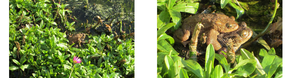 However since I removed them I’ve already seen a difference. There seem to be more tadpoles than ever. The frogs first appeared back in February and by early March over 20 clumps of spawn were clearly visible in the pond. The toads arrived a bit later, turning up in mid-March. Most have finished spawning now, however I did photograph this pair a couple of days ago. Toads lay their spawn in strings not clumps like frogs, weaving their long strands of eggs through the reeds.