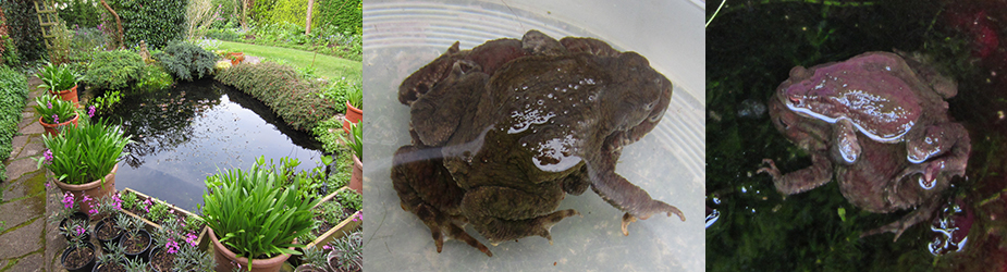 Yesterday the late pair of toads I removed from the pond on Friday laid their eggs. I temporarily re-housed them in a large bucket to avoid any fatal mishaps from over amorous male frogs drowning them. The problem was I still have a couple of dozen male frogs in the pond waiting for any late females to arrive. I think they will be disappointed as I don’t think anymore female frogs are about. However I couldn’t take the risk that they wouldn’t take a fancy to the female toad albeit a different species of amphibian. After they finished spawning they separated themselves and I put them back in the pond well away from the frogs. I expect the female toad will leave almost immediately now she’s spawned but the male toad might hang about for a bit longer. LH photo – newly laid spawn. Middle photo – pair now separated. RH photo – released back into pond.