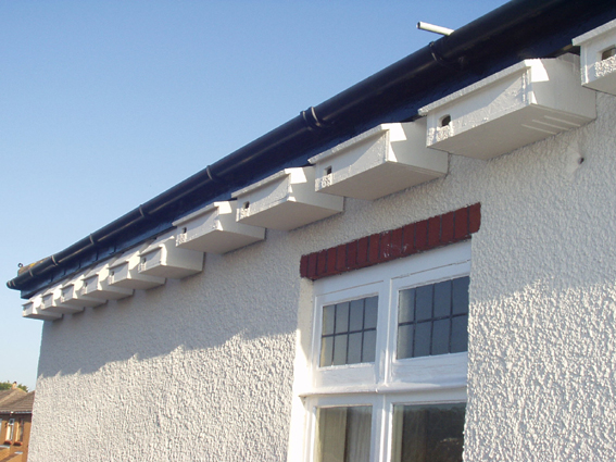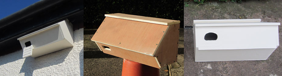 I first became aware that swifts were nesting in my house in May 2005. Whilst I was painting the front bedroom windows one flew over my head and “disappeared” under a raised roof tile. From that day I wanted to find out as much as possible about these remarkable birds. Back in those days information about swifts on the internet was very basic indeed, and my first nest box designs were rudimentary to say the least. They looked like long brown shoe-boxes with a large side entrance. I installed them in a row under the soffit above the garage which gave them only a 3 metre drop. Needless to say they weren’t very successful.